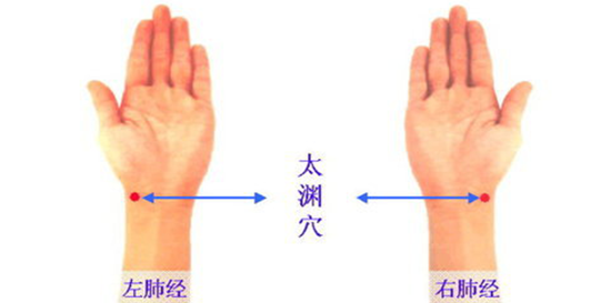 ???經(jīng)絡(luò)養(yǎng)肺:將腳浸入溫水中9分鐘之后,按肺經(jīng)太淵穴(位于腕前區(qū),橈骨莖突與舟狀骨之間,如圖)及任脈之膻中穴(在前正中線上,兩乳頭連線的中點(diǎn),如圖)各36次,最后,還可做6次深呼吸、6次漱津吞咽。